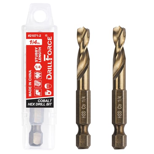 DRILLFORCE 2PCS 1/4" M35 Cobalt Stubby Drill Bit for Stainless Steel, Hard Metals & Cast Iron, with 1/4" Hex Shank for Quick Chucks & Impact Drivers